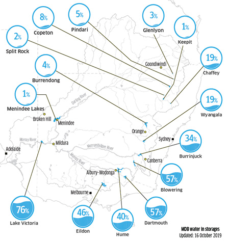 Regional towns are running out of water with dam levels dangerously low e.g. Current level and volume for Stanthorpe are 17% and 351 megalitres (ML) and, based on latest data and targeted usage, expected to run out in December 2019/January 2020. https://www.sdrc.qld.gov.au/living-here/water-wastewater/water-update  The drought is having a devastating effect on vineyards, fruit and vegetable crops in the area. https://www.abc.net.au/news/2019-10-20/stanthorpe-farmers-go-to-incredible-lengths-in-bushfires-drought/11616826