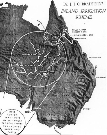 Bradfield Scheme:  In 1938 Dr John Bradfield, a Queensland born civil engineer and designer of the Sydney Harbour and Story Bridge, devised a visionary scheme aimed at drought proofing a vast area of inland Australia.  A wide variety of crops including rice, cotton, wheat and tree crops would be grown and feed for cattle and sheep produced. Water would be diverted using large pipes, tunnels, pumps and dams from the Tully, the Herbert and the Burdekin Rivers, across the Great Dividing Range into the Flinders and then the Thomson River and eventually into Lake Eyre.